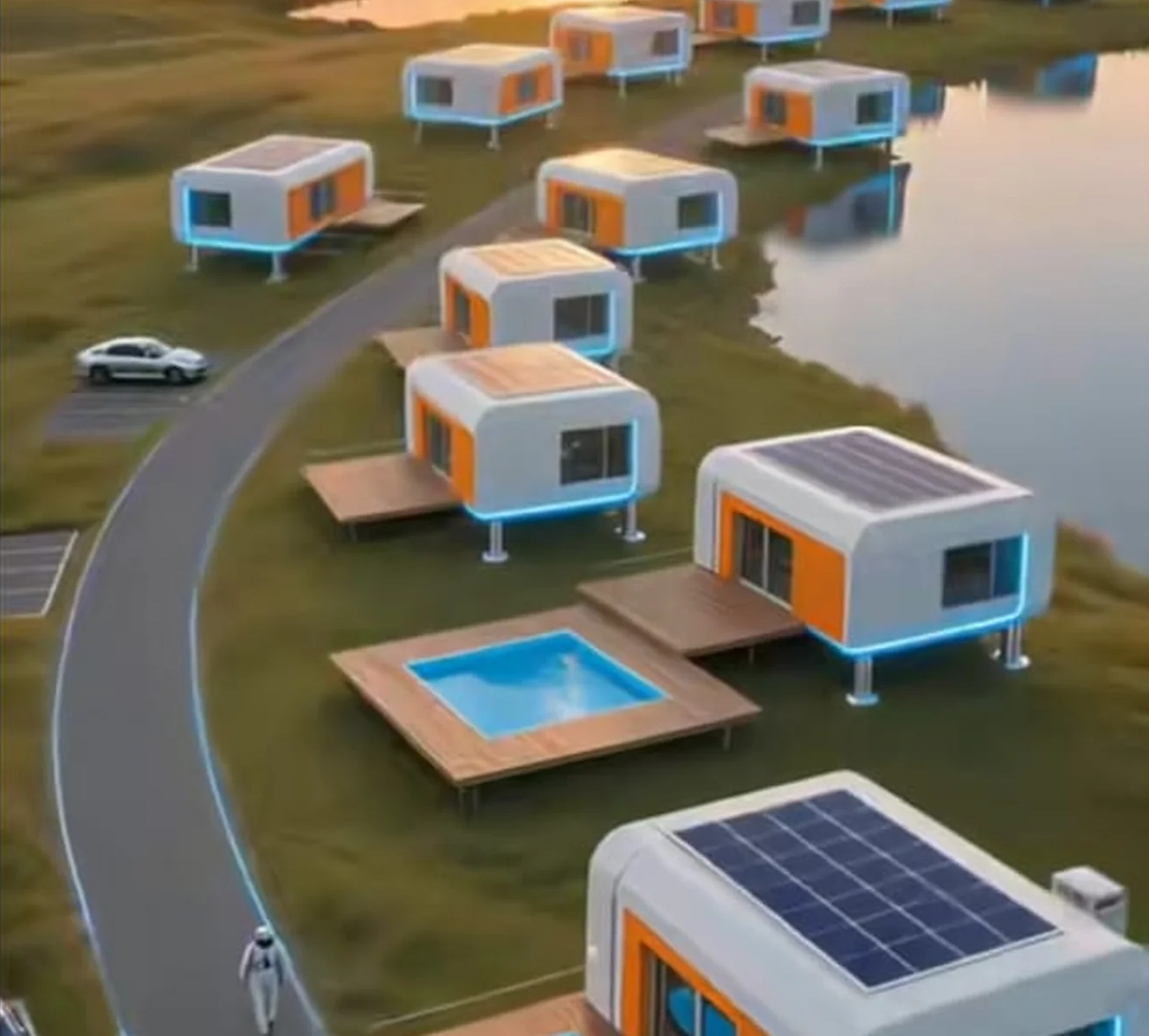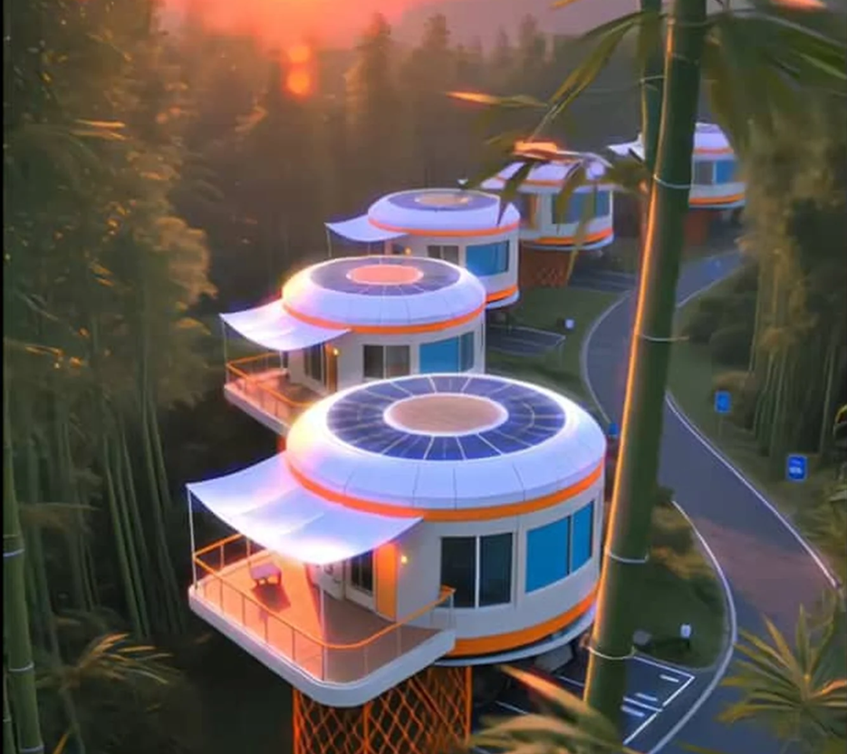 Modules circulaires préfabriqués, montage rapide, extensions faciles (terrasse, mezzanine, suite).